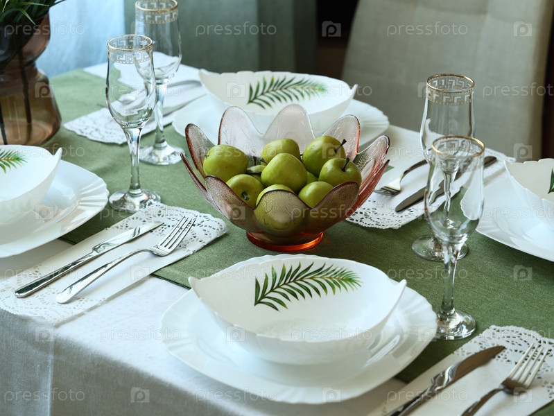 Элегантная сервировка обеденного стола со свежими зелеными яблоками и красивыми папоротниками для создания приятной атмосферы