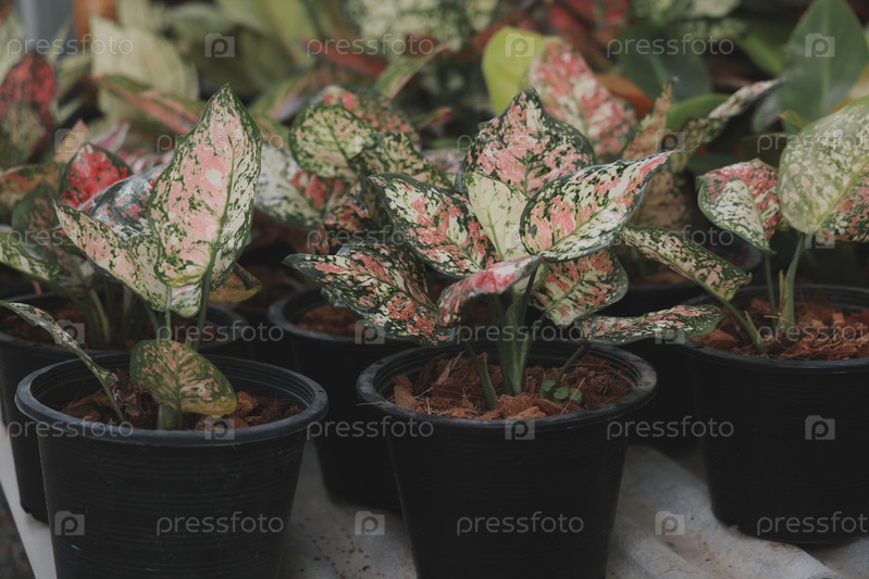 Яркие комнатные растения в горшках с разнообразной красочной листвой и зеленью