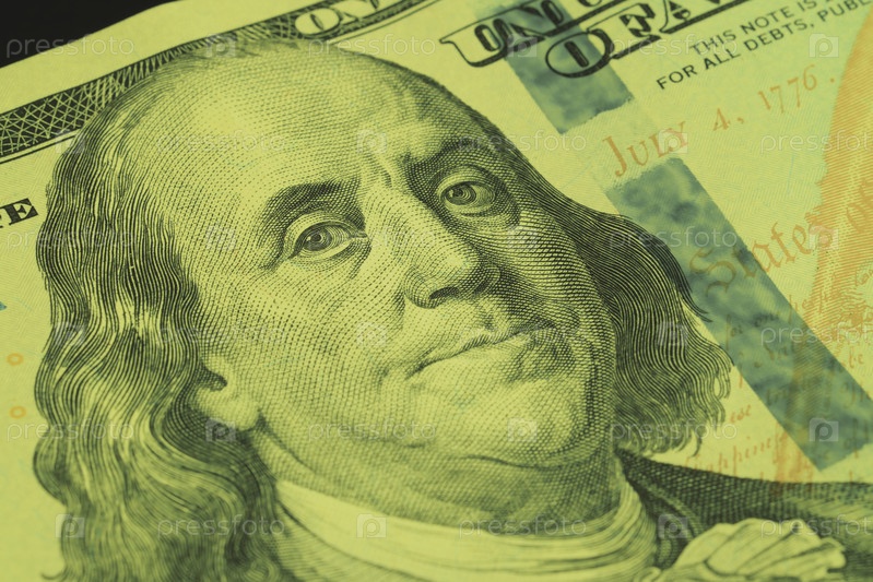 Подробный крупный план стодолларовой купюры с изображением Бенджамина Франклина