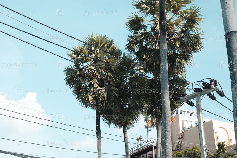 Пальмы грациозно расположены под ярким синим небом, красиво обрамленные линиями электропередач