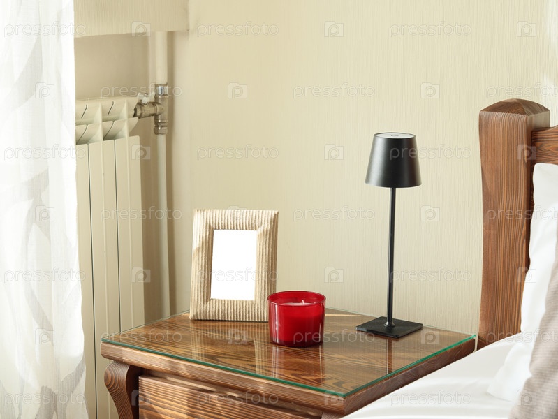 Уютная тумбочка в спальне с красивой свечой и лампой, улучшающая атмосферу