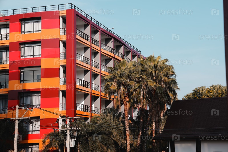 Яркий и современный жилой дом, окруженный красивыми пальмами и пейзажами