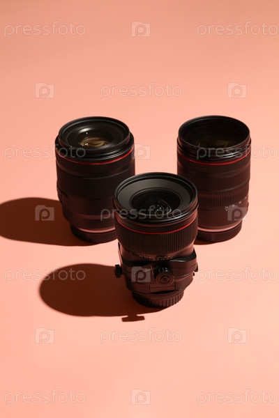 Три профессиональных объектива для фотокамер красиво представлены на ярком розовом фоне