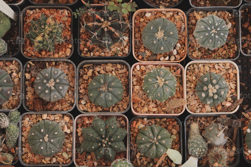 Красивый и разнообразный ассортимент кактусов в небольших горшках, элегантно расположенных для создания эстетического эффекта