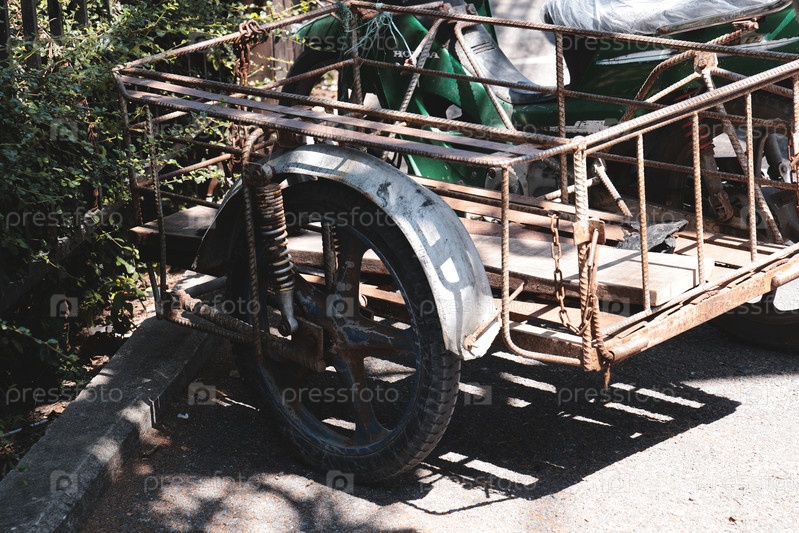 Велосипедная тележка в деревенском стиле стоит на городской улице, сочетая искусство с обществом и упадком