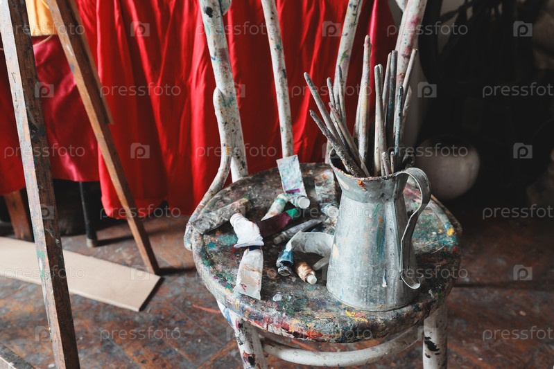 Художественная композиция с кистями и красками, расположенными на деревянном стуле для творческих проектов