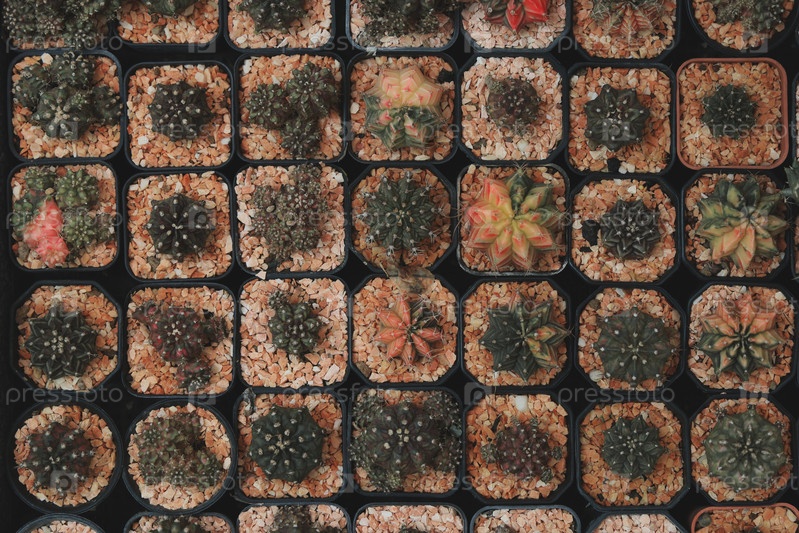 Разнообразная коллекция красивых кактусов, размещенных в стильных квадратных горшках для создания современного стиля