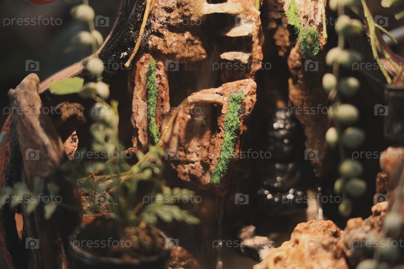 Красивый и умиротворяющий миниатюрный водопад, окруженный пышной зеленой растительностью и растениями
