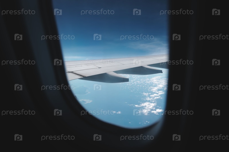 Потрясающий вид на крыло над спокойным океаном из окна самолета на большой высоте