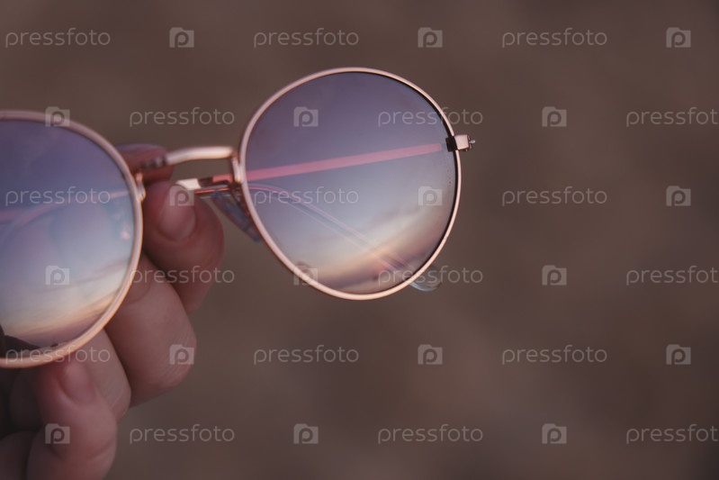 Потрясающее отражение поистине прекрасного заката, мерцающего в модных и стильных солнцезащитных очках
