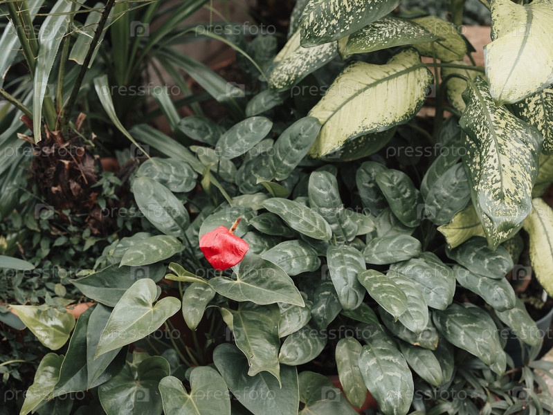Красивый и яркий красный цветок, изящно расположенный среди пышной зеленой листвы
