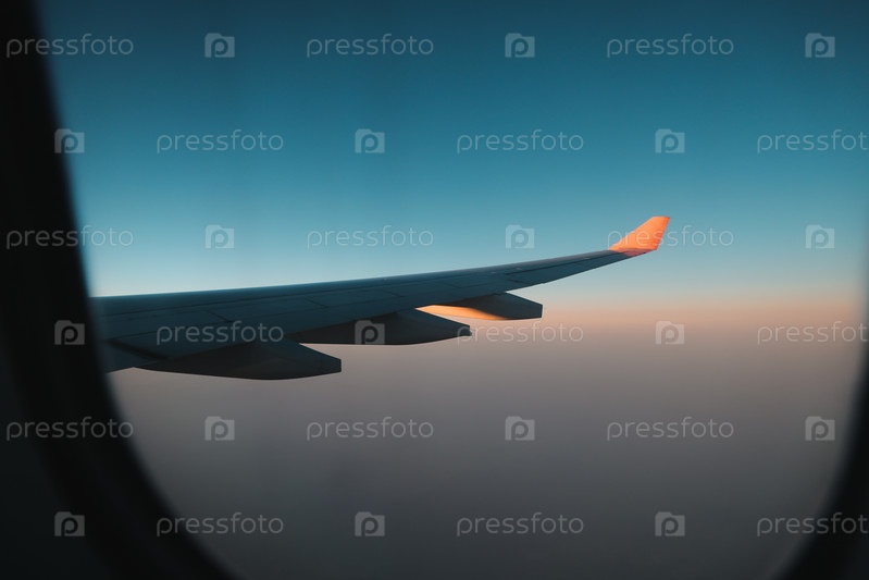Силуэт крыла самолета на фоне красивого красочного неба в сумерках во время заката