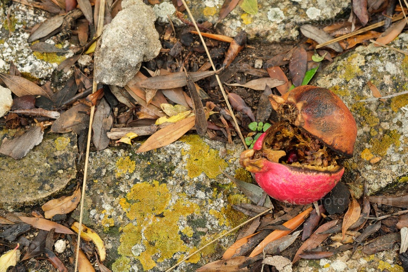 Плод граната, упавший на землю осенним днем. Изолированный фон