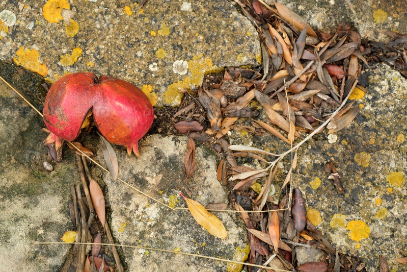 Плод граната, упавший на землю осенним днем. Изолированный фон