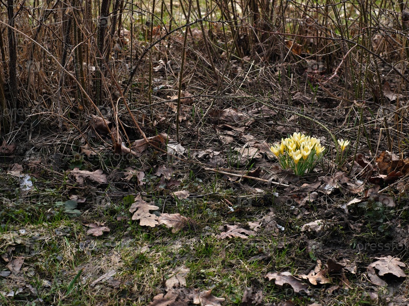 Цветущие крокусы весной в сухой траве. Изолированный фон