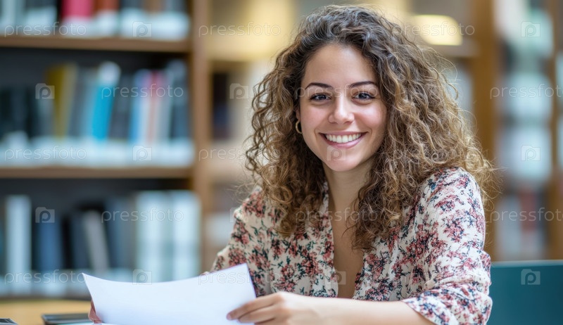 Женщина с вьющимися волосами, одетая в цветочную блузку, читает документы в библиотеке, создавая атмосферу учебы и сосредоточенности