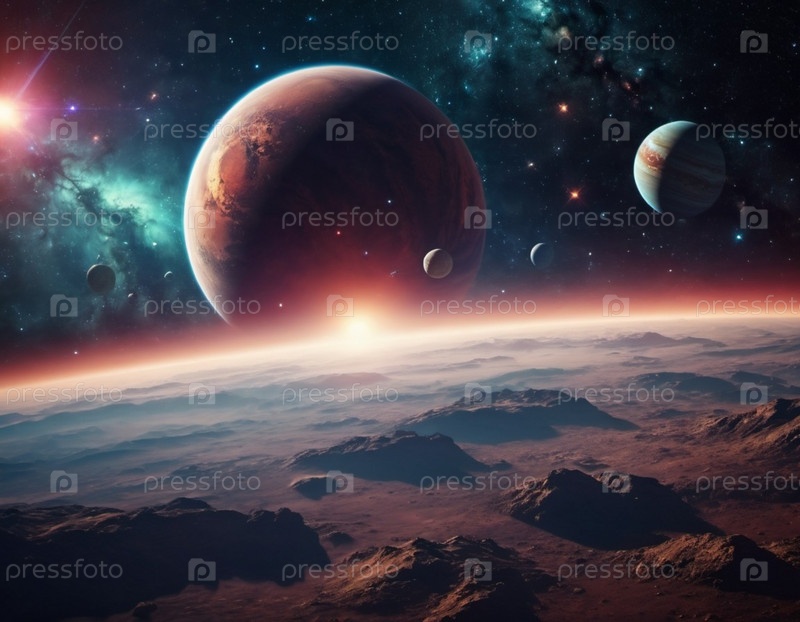 Планетарная система с несколькими планетами, большим ярко окрашенным газовым гигантом и каменистой планетой. Яркие звезды и огромное пространство темного космоса с галактикой на заднем плане. Космические просторы. Космонавтика. ИИ