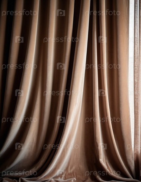 Штора с мягкими плавными струящимися складками. Глубокий бежевый цвет и роскошная фактура создают драматичную и элегантную атмосферу. Декор и дизайн интерьера. Дорогая штора из богатой ткани. AI