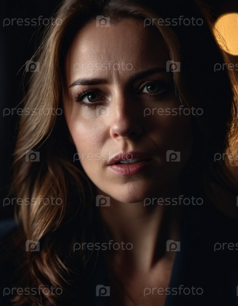 Женщина с нахмуренными бровями и обеспокоенным выражением лица смотрит прямо в камеру. Освещение тусклое, отбрасывает тени вокруг лица, подчеркивая ее стресс. Страх, разочарование, расстройство, беспокойство и задумчивость. ИИ