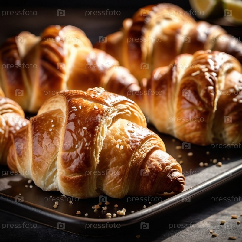 Ассорти из золотисто-коричневых круассанов на деревенском подносе. Теплый ароматный аромат наполняет уютную кухню. Привлекательная выкладка предполагает расслабляющую утреннюю встречу, идеальный завтрак-бранч с друзьями семьи