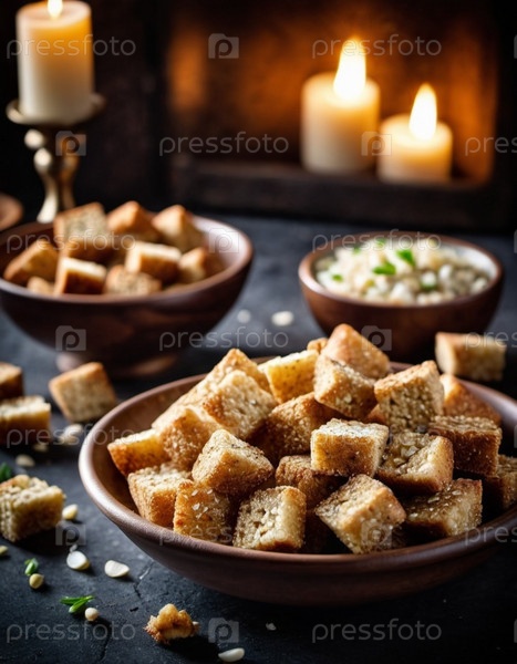 Запеченные ржаные гренки солят и настаивают на чесноке, создавая пикантную закуску, художественно оформленную в глубокой коричневой миске, окруженную. Мягкая начинка. Идеально подходит для супов, салатов или закуски к пиву