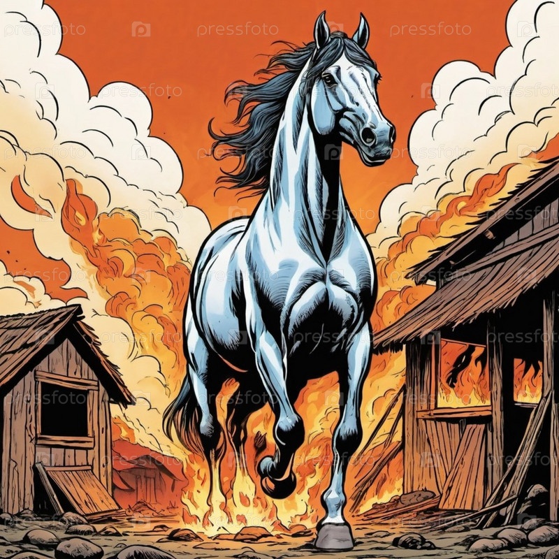 Лошадь встает на дыбы среди сильного пламени и густого дыма, которые окутывают деревянную избу. Огонь потрескивает. Русская пословица: есть женщины в русских деревнях, которые могут остановить коня на скаку и войти в горящую избу