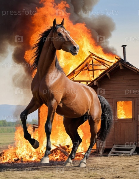 Лошадь встает на дыбы среди сильного пламени и густого дыма, которые окутывают деревянную избу. Огонь потрескивает. Русская пословица: есть женщины в русских деревнях, которые могут остановить коня на скаку и войти в горящую избу