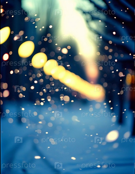 Зима приносит мягкий снегопад на городские улицы, где разноцветные огни висят над головой, создавая теплую и праздничную атмосферу. Эффект боке от огней добавляет причудливый штрих, подчеркивая радость сезона
