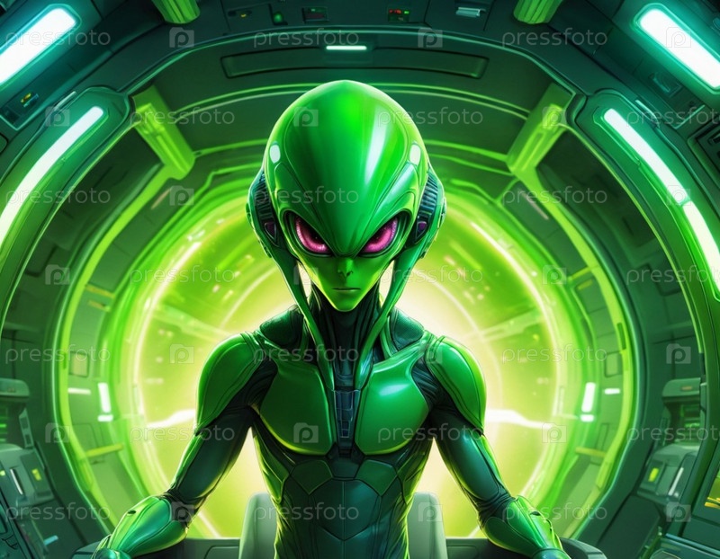 Встреча с инопланетянами в пустоте на борту футуристического космического корабля во время межзвездного путешествия через глубокий космос, раскрывающая таинственное существо. Генеративный ИИ