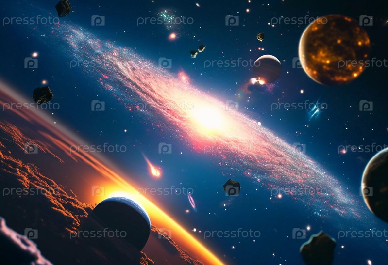 Вселенная космос пространство и время. Космические объекты планеты звезды свечения кометы туманности спутники и метеориты. Гравитационно связанная система межзвездного газа, пыли и темной материи, галактики. ИИ