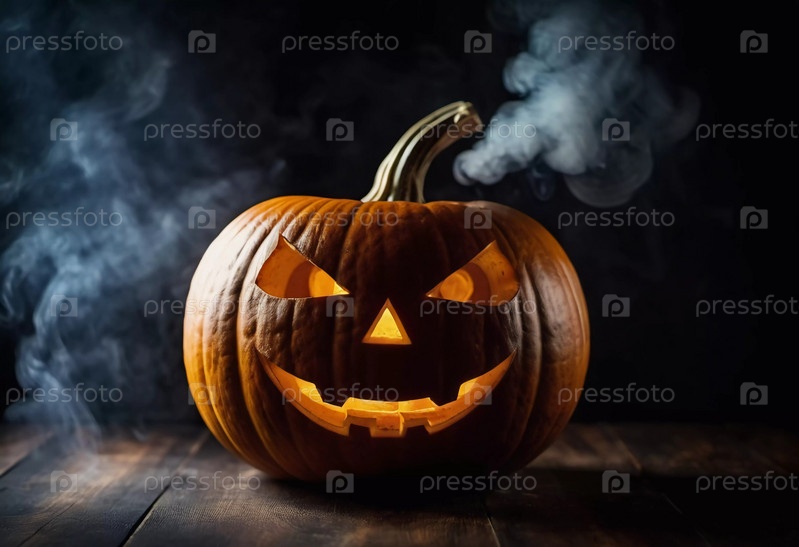 Вырезанная тыква на Хэллоуин имеет угрожающее лицо, подсвеченное изнутри, с дымом, поднимающимся вверх, что усиливает тревожную атмосферу вечера. Генеративный ИИ