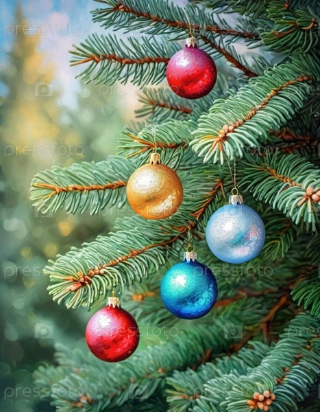 Красочные рождественские украшения украшают ветви ели, яркие шары в оттенках красного, золотого и розового, олицетворяющие праздничное настроение зимой. Художественный фон Happy New Year. Генеративный ИИ