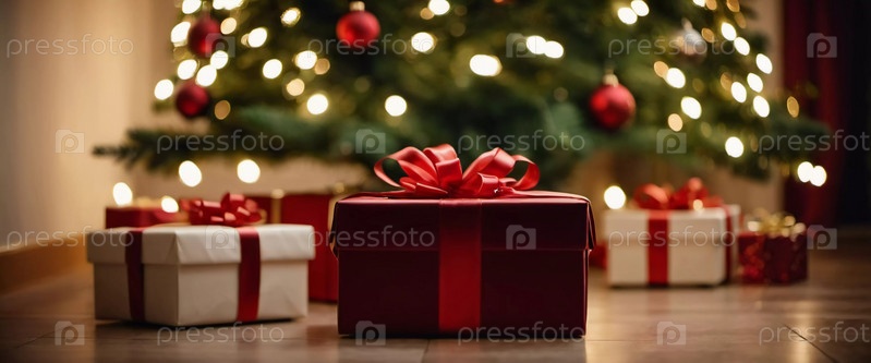 Уютная гостиная, украшенная праздничной рождественской елкой, украшенной сверкающими огнями и красочными безделушками, окруженная множеством тщательно упакованных подарочных коробок, ожидающих открытия. Искусство ИИ