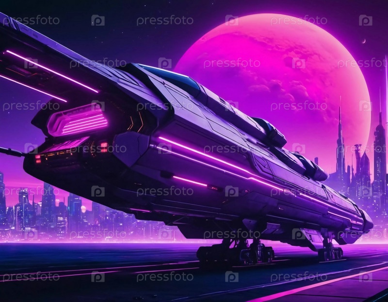 Футуристические космические корабли бороздят завораживающую вселенную, наполненную неоновыми оттенками, демонстрируя передовые технологии на фоне светящихся городских пейзажей. Генеративный ИИ