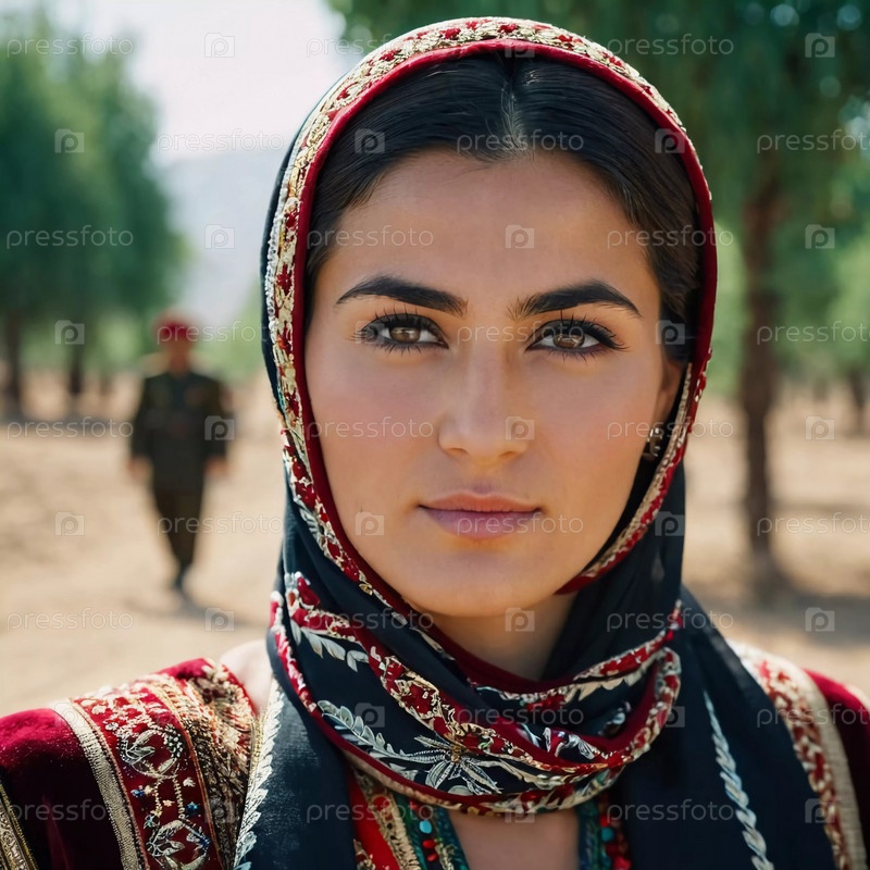 Таджикская женщина 30 лет грациозно стоит, демонстрируя свой традиционный наряд на захватывающем фоне гор и сочных зеленых полей, отражая ее культурные корни. Сгенерировано с помощью ИИ