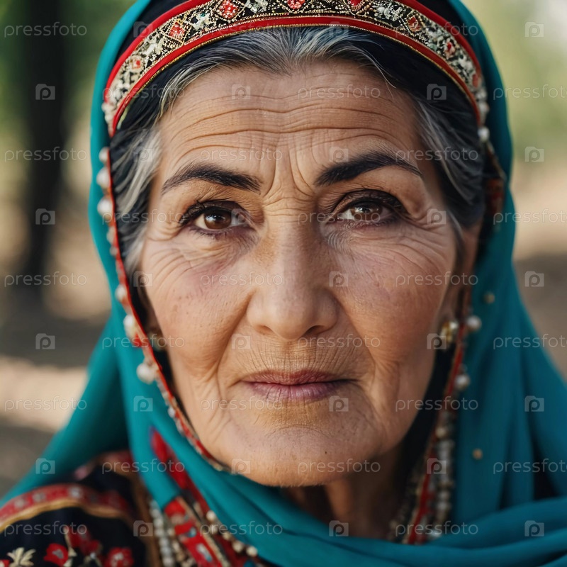 Зрелая таджикская женщина 75 лет, смотрит прямо, демонстрируя сложную традиционную одежду, богатое культурное наследие своей национальности, пробуждая мудрость и изящество. Брюнетка, в платке. AI