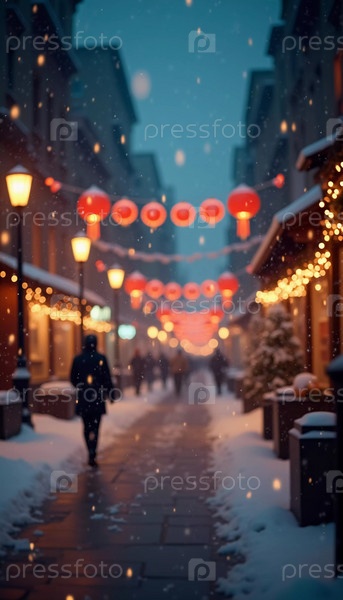 Тихий зимний вечер окутывает городскую улицу, где мягко падающий снег усиливает свечение рождественских огней. Праздничная атмосфера привлекает людей, празднующих Новый год. Генеративный ИИ