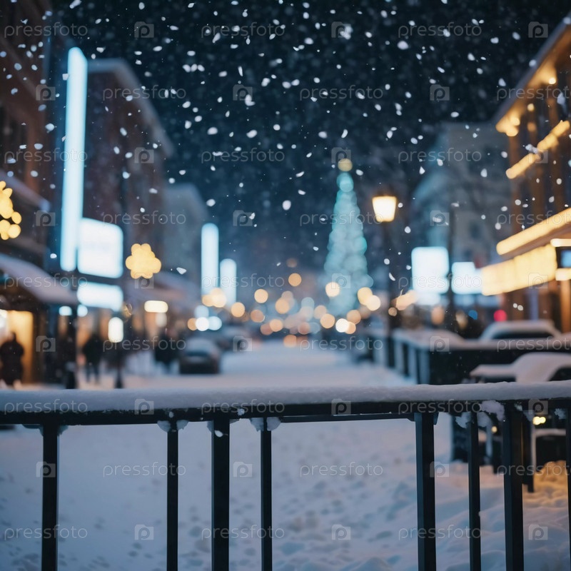 Тихий зимний вечер окутывает городскую улицу, где мягко падающий снег усиливает свечение рождественских огней. Праздничная атмосфера привлекает людей, празднующих Новый год. Генеративный ИИ