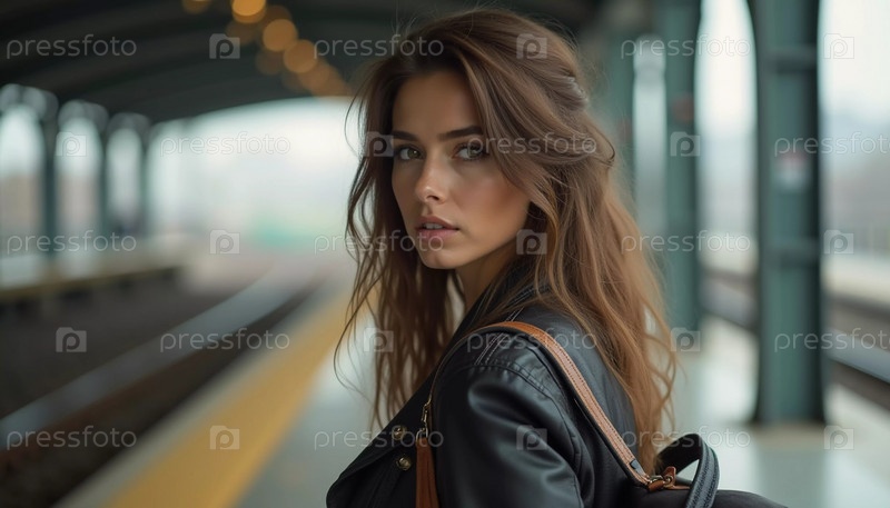 Девушка с волнистыми волосами стоит на вокзале, поворачиваясь, чтобы посмотреть в камеру, держа чемодан. Путешественники суетятся мимо нее, пока она ждет свой поезд. Красивая молодая женщина. Генеративный ИИ