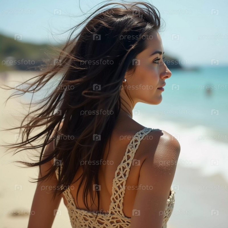 Брюнетка в купальнике смотрит назад, стоя у береговой линии. Нежные морские волны плещутся у ее ног под ясным голубым небом. Длинные волосы, красивое молодое лицо. Реклама путешествий и одежды. AI