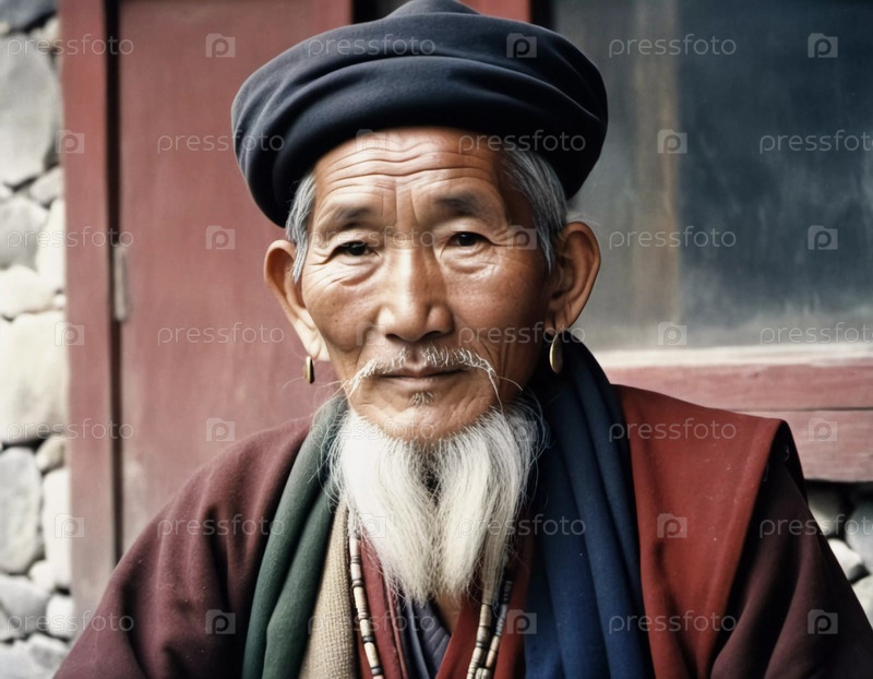Традиционный пожилой тибетский мужчина 70 лет с отличительными чертами лица позирует на деревенском фоне, отражая его богатую культурную идентичность и наследие. Мудрый серьезный прямой взгляд. Генеративный ИИ