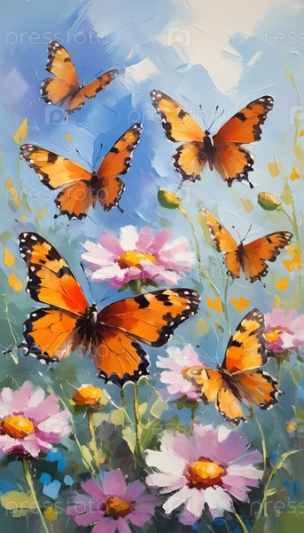 Красочные бабочки грациозно порхают над яркими полями, создавая живую и радостную атмосферу на залитом солнцем лугу. Генеративный ИИ