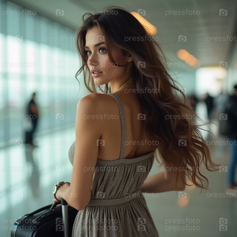 Стильная брюнетка стоит в аэропорту, держа чемодан и оглядываясь назад с уверенным выражением лица. Путешественники суетятся вокруг нее, пока она ждет, одетая в повседневную облегающую одежду. Генеративный ИИ