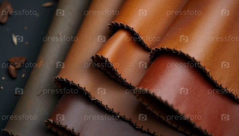 Образцы натуральной коровьей кожи разных цветов аккуратно разложены на поверхности, демонстрируя уникальные текстуры и качества каждого изделия. Эта коллекция подчеркивает мастерство. GenerativeAI