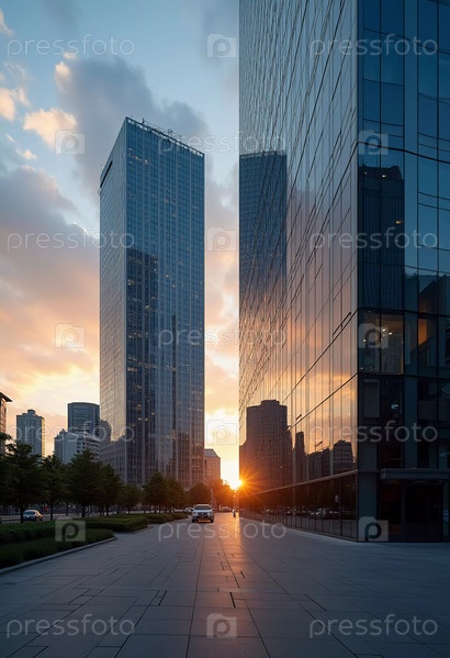 Высотное офисное здание с большими стеклянными окнами отражает яркие цвета заката. Городское окружение и чистое небо создают безмятежную атмосферу, когда день переходит в ночь. GenerativeAI