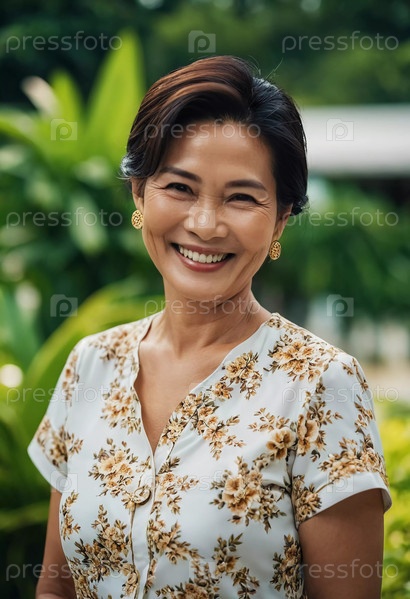 Женщина лет сорока наслаждается солнечным днем в Таиланде, одетая в цветочную рубашку и ярко улыбаясь. Окруженная богатой зеленью, она излучает счастье и энергию. Генеративный ИИ