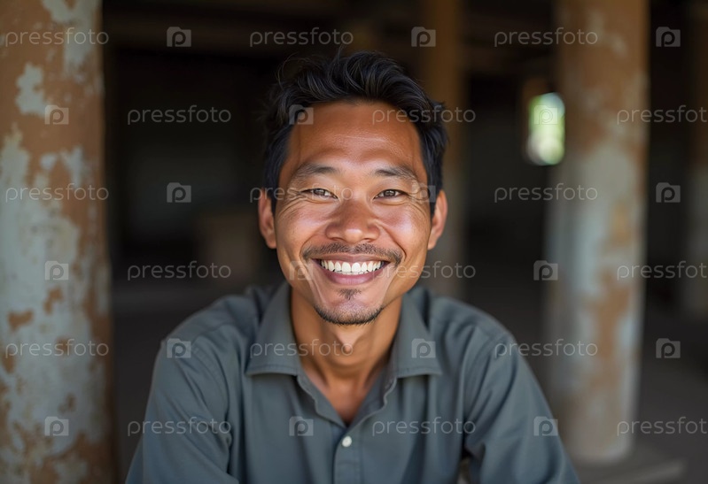 Веселый мужчина из Таиланда широко улыбается, сидя внутри старого здания. Его радостное выражение лица передает теплоту и дружелюбие, характерные для местной культуры. Генеративный ИИ