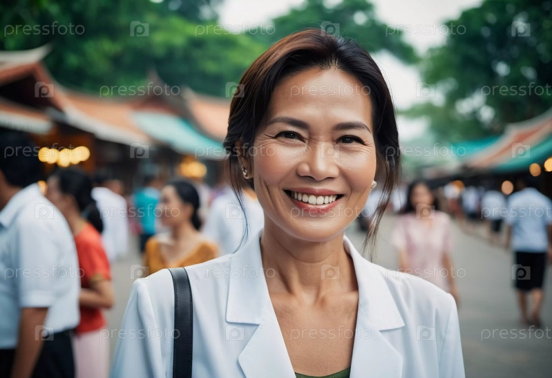 Жизнерадостная женщина лет сорока, одетая в белое, улыбается на оживленном рынке в Таиланде. Генеративный ИИ