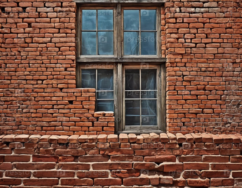 Выветренная кирпичная стена имеет неровный проем для старого деревянного окна с несколькими стеклами. Кирпичи демонстрируют различные оттенки и текстуры, намекая на возраст и историю. Генеративный ИИ