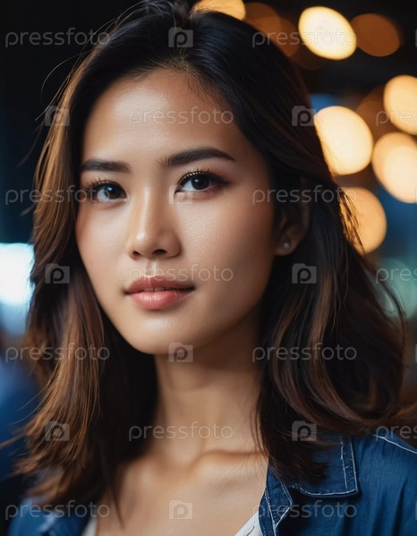 Молодая женщина, проживающая в Таиланде, запечатлена с мягкой улыбкой и естественной красотой. На заднем плане — теплые огни боке, создающие живую атмосферу вечером